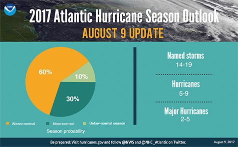 As of the August 9th update, NOAA is forecasting an above average for the Atlantic with 14 to 19 named storms (with winds of 39 mph or higher), of which 5 to 9 could become hurricanes (winds of 74 mph or higher), including 2 to 5 major hurricanes (Category 3, 4 or 5; winds of 111 mph or higher).