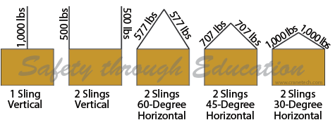 The illustration above, adapted from the Crane Tech Qualified Rigger Level 1 Manual, demonstrates how sling stress is distributed across slings in various configurations for a 1,000 lb load.